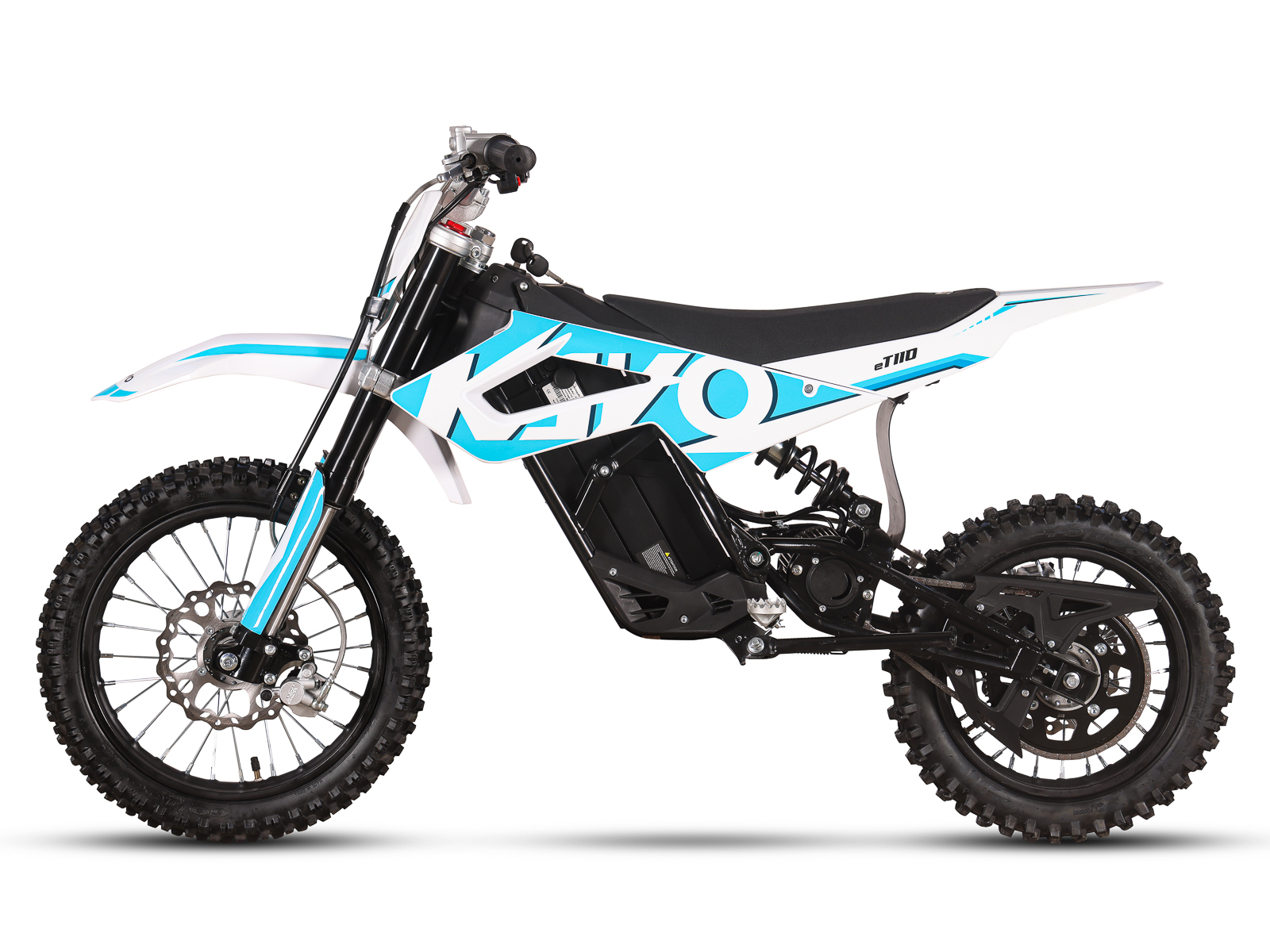 The eT110 is Kayos first serious electric dirt bike (14/12 configuration) aimed at youth riders and teens. Boasting peak power of 3.5 kw it’s got plenty of grunt and will accelerate quickly to a top speed of 34 MPH. Featuring 3 x speed / power settings and a patented quick-change battery system Kayo have put some considerable effort into the design of this bike. The battery can be charged in 5.5 hours and purists will be excited to see this bike uses proper pit bike brakes as opposed to MTB brakes.